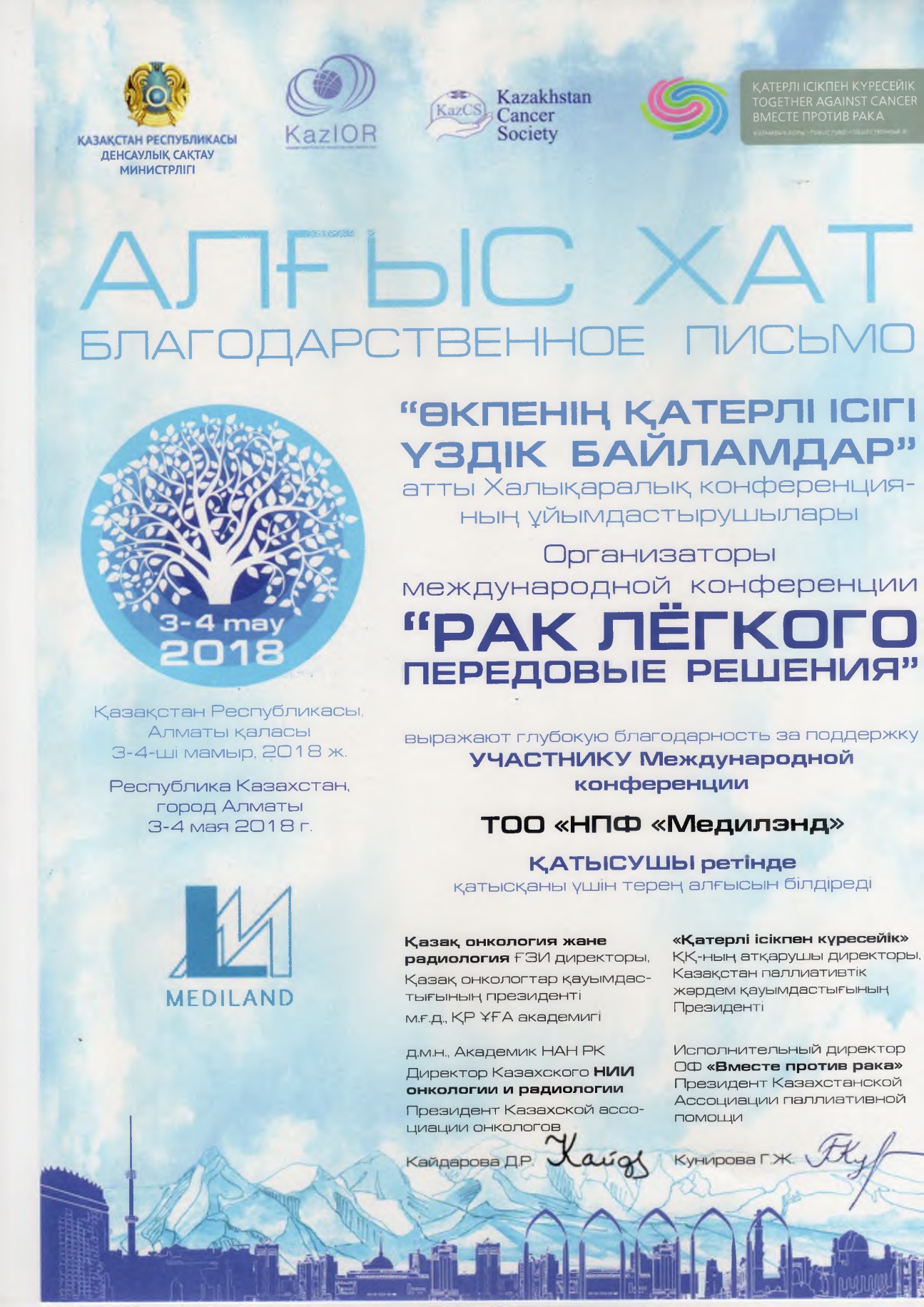 3-4 мая 2018 г. в Алматы прошла Международная конференция «Рак легкого. Передовые решения», который организовали РГП на ПХВ «Казахский научно-исследовательский институт онкологии и радиологии» и ОО «Казахстанская ассоциация онкологов» при поддержке Министерства здравоохранения Республики Казахстан и Общественного Фонда «Вместе против рака». ТОО «Научно-производственная фирма «Медилэнд» выступило одним из спонсоров данного мероприятия.